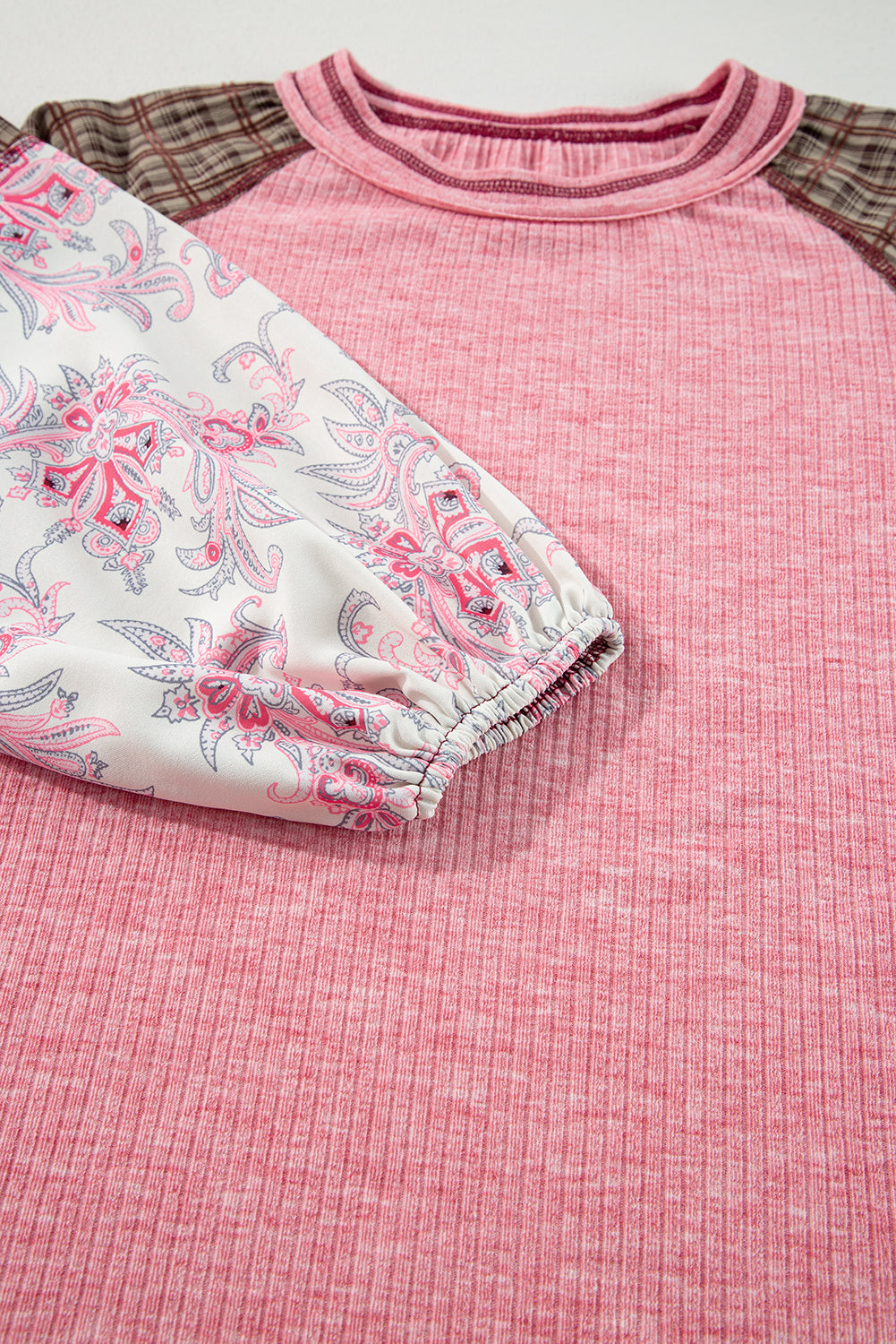 Fushia Floral Plaid Mixed Print Patchwork Raglan Ribbed Top